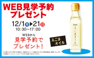 WEB見学予約で「maruta えごまオイル」プレゼント!モデルハウス事前予約で嬉しい特典♪ WEBから見学予約でプレゼント! ●日程:12/1(月)〜12/21(日)●時間:10:30~17:00 ※2棟以上のご予約で […]
