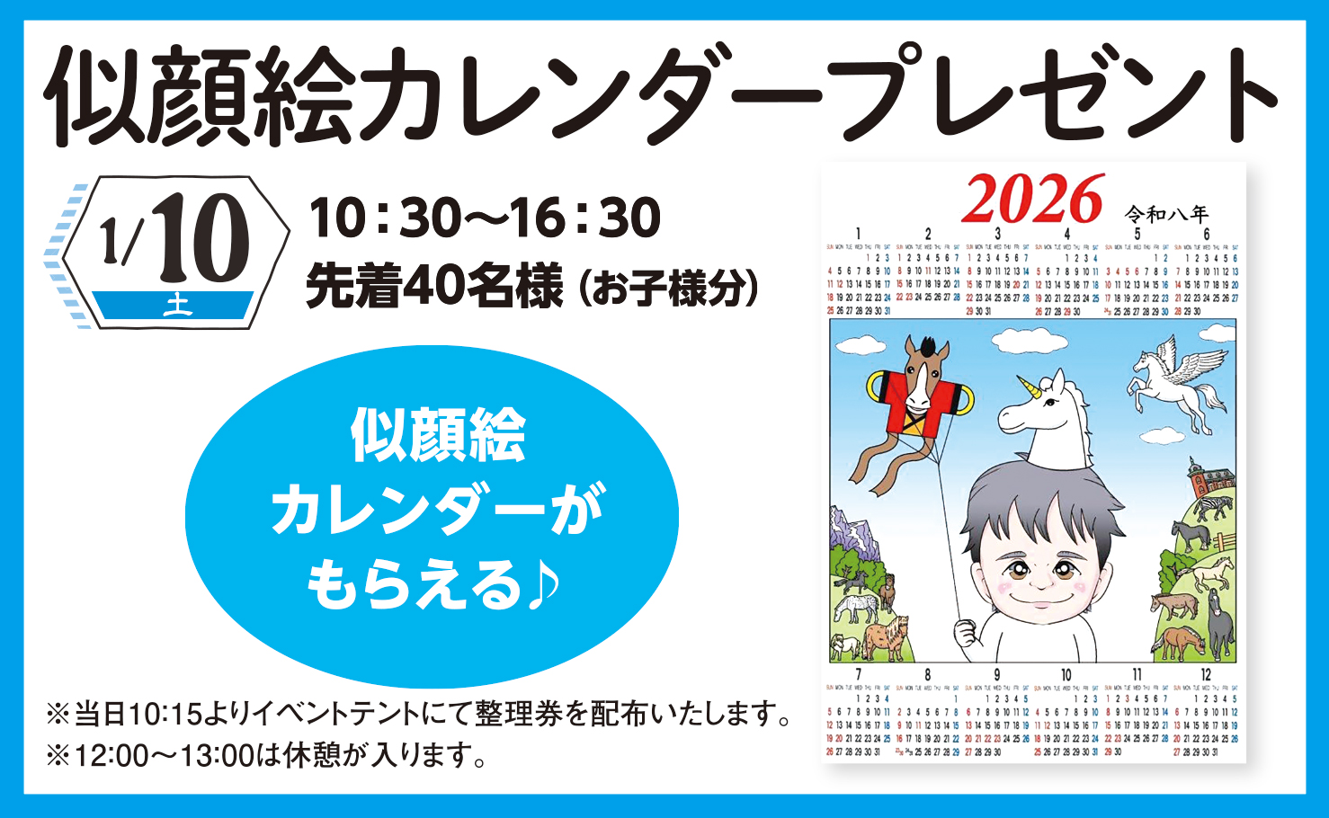似顔絵カレンダーがもらえる♪ ●日程:1/10(土)●時間:10:30~16:30●参加:先着40名様(お子様分) ※当日10:15よりイベントテントにて整理券を配布いたします。※12:00~13:00は休憩が入ります。 見学予約|1回に3棟まで可能