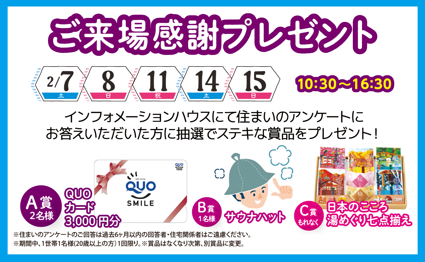 インフォメーションハウスにて住まいのアンケートにお答えいただいた方に、抽選でステキな賞品をプレゼント! ●日程:2/7(土)・2/8(日)・2/11(祝)・2/14(土)・2/15(日)●時間:10:30~16:30 ※住まいのアンケートのご回答は過去6ヶ月以内の回答者・住宅関係者はご遠慮ください。※期間中、1世帯1名様(20歳以上の方)1回限り。※賞品はなくなり次第、別賞品に変更。 見学予約|1回に3棟まで可能