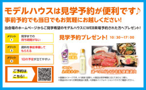 イベント概要 モデルハウスにてアンケートにお答えいただいた方にスタンプを押印します。スタンプ2つで素敵な賞品をプレゼント! ●日程:4/20(土)~5/6(休)の土・日・祝・休日●時間:10:30~17:00 ※期間中、1家族いずれかおひとつ。※賞品が品切れの際、別賞品に変更いたします。※スタンプ押印条件は各モデルハウスにより異なります。※参加用紙はイベントテントで配布します。 見学予約|1回に3棟まで可能